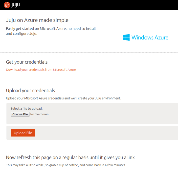 When starting the Juju template on an A1 instance, users will be presented with a web page (see below) and a link to download the Azure “Publish Settings” file.