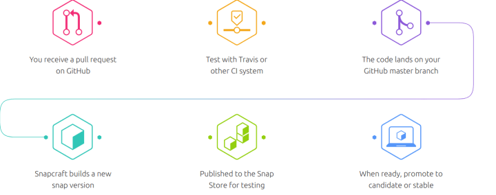 Furthermore, Snapcraft improves embedded Linux development by easily integrating into existing CI systems. After receiving a PR on GitHub, you can test it with e.g. Travis or another CI system, and the code lands on your GitHub master. Seamless integration with Travis, Jenkins, GitLab and TeamCity can generate automatic snap builds on every Git commit.