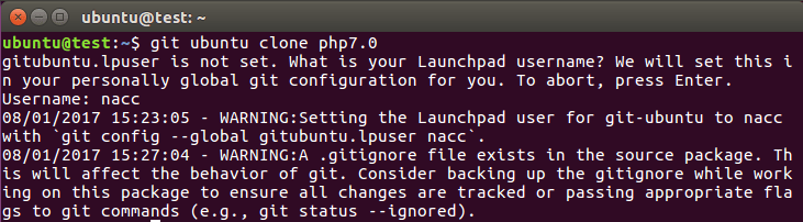 Let’s say we are interested in looking at the state of PHP 7.0 in Ubuntu. First, we obtain a local copy of the repository***: git ubuntu clone php7.0