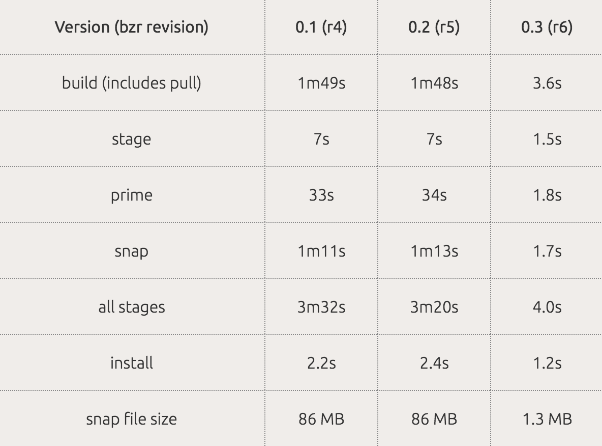 We demonstrated three different approaches to creating a UITK gallery snap, which we gave the version numbers 0.1, 0.2 and 0.3. For each of the approaches, the table below lists the time needed for the different stages of a snapcraft run, but the pull and build stages have been combined because when doing pull, some of the prerequisites need to be built already. The all stages row shows the total time when running the snapcraft command in a clean directory, so that all stages are executed sequentially, so the value is less than the sum of the previous rows in the table because in each stage it is not necessary to check completion of the previous stages
