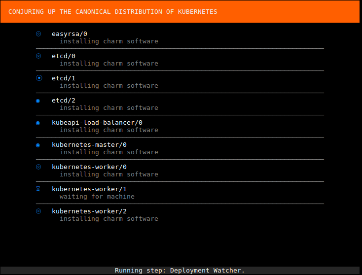 $ conjure-up canonical-kubernetes localhost conjure-up-localhost-642 cluster2 [info] Summoning canonical-kubernetes to localhost [info] Creating Juju model. [info] Juju model created. [info] Running step: pre-deploy. [info] Deploying kubernetes-master... [info] Deploying flannel... [info] Deploying kubernetes-worker... [info] Deploying easyrsa... [info] Deploying kubeapi-load-balancer... [info] Deploying etcd... [info] Exposing kubeapi-load-balancer. [info] etcd: deployed, installing. [info] kubeapi-load-balancer: deployed, installing. [info] easyrsa: deployed, installing. [info] flannel: deployed, installing. [info] kubernetes-master: deployed, installing. [info] Setting relation easyrsa:client <-> etcd:certificates [info] Exposing kubernetes-worker. [info] kubernetes-worker: deployed, installing. [info] Setting relation flannel:cni <-> kubernetes-worker:cni [info] Setting relation easyrsa:client <-> kubeapi-load-balancer:certificates [info] Setting relation kubeapi-load-balancer:apiserver <-> kubernetes-master:kube-api-endpoint [info] Setting relation kubeapi-load-balancer:website <-> kubernetes-worker:kube-api-endpoint [info] Setting relation flannel:cni <-> kubernetes-master:cni [info] Setting relation etcd:db <-> flannel:etcd [info] Setting relation easyrsa:client <-> kubernetes-master:certificates [info] Setting relation kubernetes-master:kube-control <-> kubernetes-worker:kube-control [info] Setting relation kubeapi-load-balancer:loadbalancer <-> kubernetes-master:loadbalancer [info] Setting relation easyrsa:client <-> kubernetes-worker:certificates [info] Setting relation etcd:db <-> kubernetes-master:etcd [info] Waiting for deployment to settle. [info] Running step: 00_deploy-done. [info] Model settled. [info] Running post-deployment steps [info] Running step: step-01_get-kubectl. [info] Running step: step-02_cluster-info. [info] Running step: step-03_enable-cni. [info] Installation of your big software is now complete. [warning] Shutting down