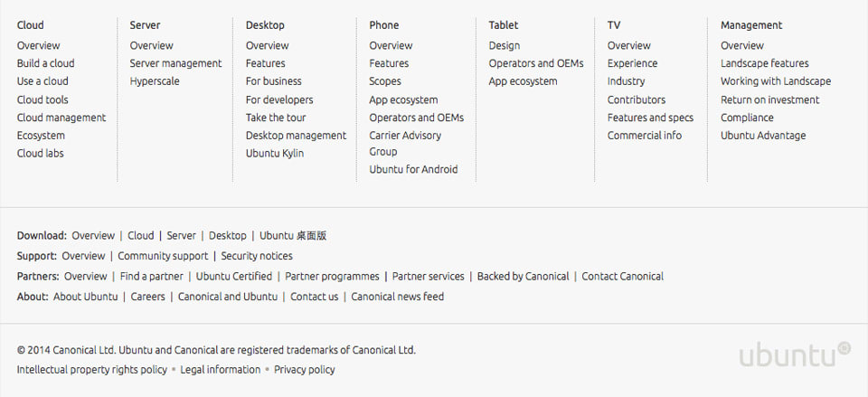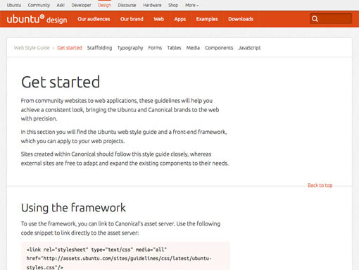 The front end framework that powers www.ubuntu.com represents the visual evolution of the site over the past few years: designs have become cleaner, lighter and more open. It was designed without responsiveness in mind, but it has proven flexible, robust and great for our needs: user experience designers can quickly create wireframes for new and updated pages based on existing patterns and developers can create new pages that look good with little input from designers.