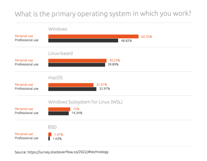 In the developer OS space, macOS and Ubuntu have a roughly equivalent market share. According to the HackerEarth developer survey 2021, 23.7% of developers preferred Ubuntu whilst 24.4% favoured macOS. The StackOverflow developer survey 2022 – which offered a multiple choice response- provided a similar insight, with 54% of professional developers using Linux as their primary development environment (either natively or via Windows Subsystem for Linux) and 33% using macOS.